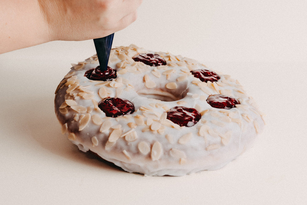 Vanilla Frosting, Flaked Almonds, Cherry Pie Filling