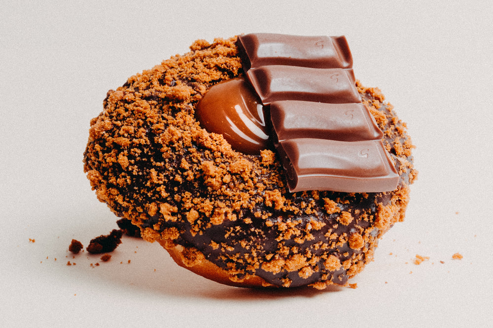Dipped in chocolate frosting and biscoff crumb, filled with caramel and finished with a salted caramel galaxy chocolate bar.