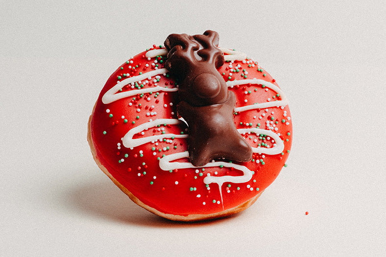 Red Vanilla Frosting, Sprinkles, White Chocolate Drizzle, Malteser Reindeer