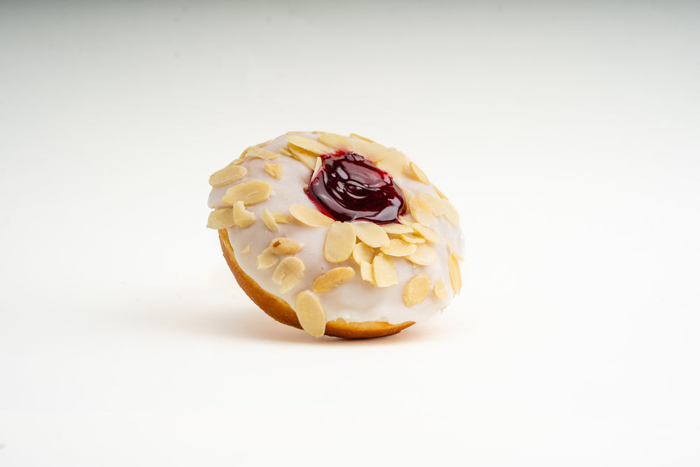 Dipped in vanilla frosting, sprinkled with almond flakes and filled with sweet cherry pie filling.