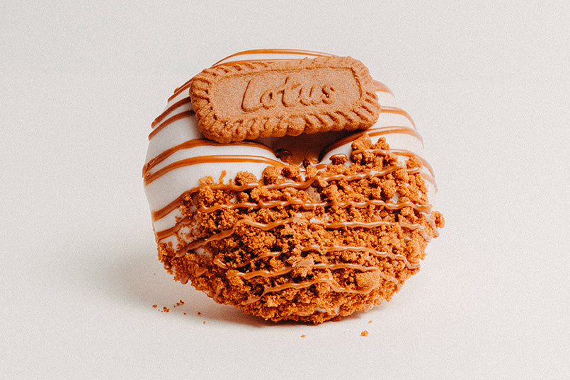 Dipped in white chocolate frosting and biscoff crumb, drizzled with biscoff spread and finished with a biscoff biscuit.
